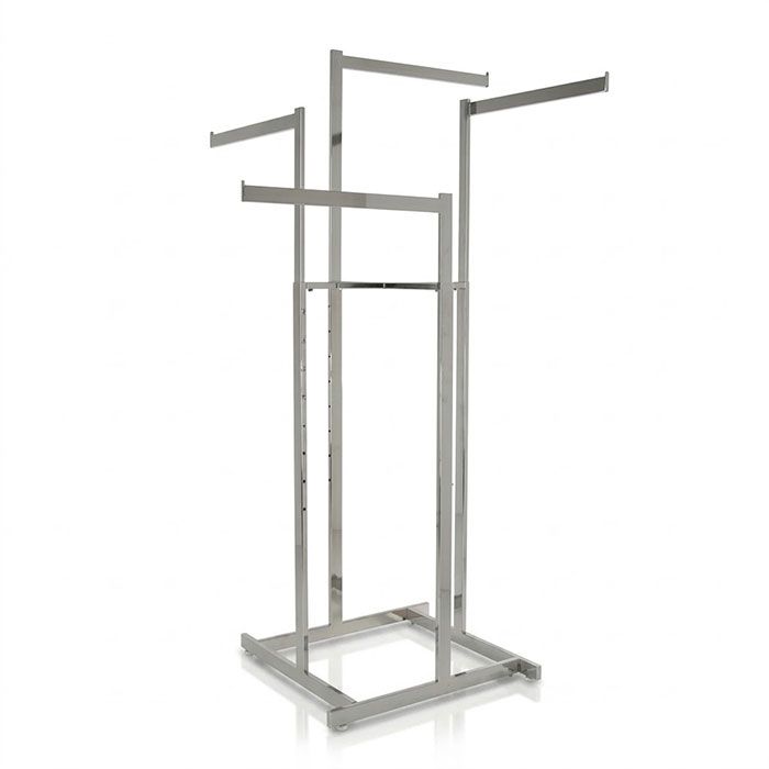 Expert Insight: Strategic Store Layout with the 4W15 The 4W15 High-Capacity 4-Way Clothing Rack is a primary "traffic controller" for modern retail floors. While standard H-racks are designed for bulk inventory, the 4-way rack is engineered for merchandise storytelling. Because each of the four arms adjusts independently from 48" to 72", you can display a cohesive "outfit story." For example, hang floor-length maxi skirts or dresses on one arm and coordinating crop tops or accessories on the adjacent arm—all at their respective ideal sightlines. This eliminates the "staggered" visual noise of fixed-height racks, directing the customer's eye exactly where you want it to land.Choosing the Right Anchor: Product Comparison Feature 4-Way High-Capacity (4W15) 2-Way Waterfall Double Bar H-Rack Best Used For Full Collections / "Outfit Stories" Boutique Highlights / Entrances Bulk Inventory / Clearance Footprint Compact / Central Floor Anchor Slim / High-Visibility Zones Large / Perimeter Walls Arm Style 4 x 22" Straight Blade Arms 2 x Waterfall or Straight Dual 60" Hang Rails Height Adjustment Independent (3" increments) Independent Synchronized Dual RailsCommercial-Grade Performance Features Adaptive Merchandising: The quick-release push-button arms adjust from 48" to 72". This allows retailers to transition seamlessly from summer shorts to winter overcoats without purchasing new fixtures. Architectural Blade Arms: Our 22" L × 1-1/2" W rectangular blade arms keep hangers perfectly aligned. Unlike round arms, these prevent the "fan-out" effect, ensuring your labels stay visible to the shopper. Stability Levelers: Equipped with industrial-grade adjustable base levelers to eliminate wobbling on uneven boutique or showroom floors. Durable Chrome Finish: Engineered to withstand the friction of metal hangers, maintaining a high-end polished look under heavy daily use. Merchandising Pro-Tip: The "Cross-Sell Anchor" Maximize the 4W15 by using two opposing arms for your main size runs. Use the third arm for a coordinated accessory (like a handbag or scarf). On the fourth arm, attach a threaded stem sign holder to announce promotional pricing or "Complete the Look" suggestions. This transforms a standard rack into a self-service sales consultant. Shipping & Assembly Delivery: Allow 5–7 business days. Shipping Quote: Simply add the item to your shopping cart for an instant estimate. Assembly: Quick, straightforward setup. To maintain garment shape and professional presentation, we recommend pairing this rack with our Premium Wooden Clothes Hangers and using Sign Holders for clear pricing.