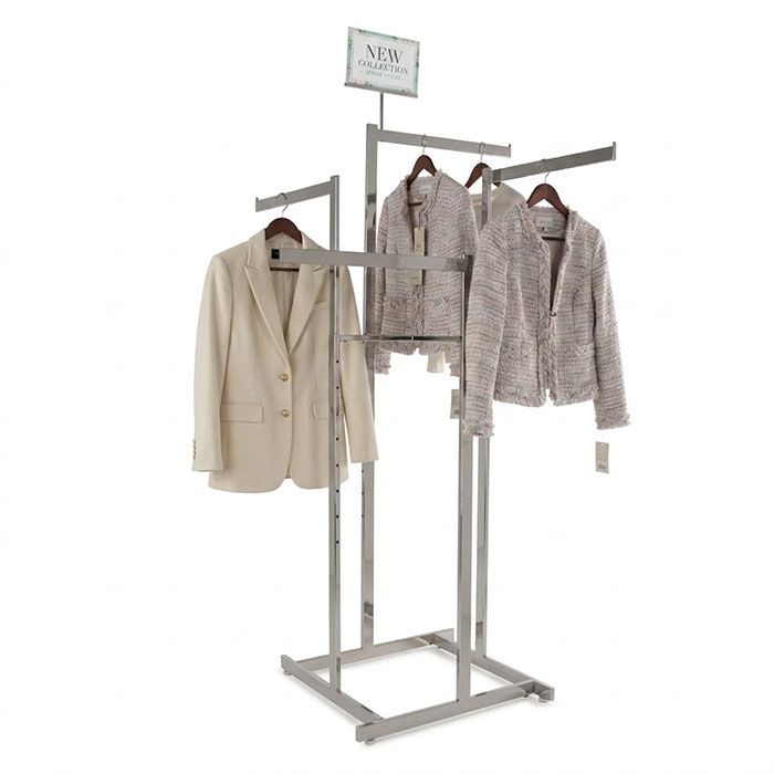 Maximize the 4W15 by using two opposing arms for your main size runs. Use the third arm for a coordinated accessory (like a handbag or scarf). On the fourth arm, attach a threaded stem sign holder to announce promotional pricing or "Complete the Look" suggestions. This transforms a standard rack into a self-service sales consultant.