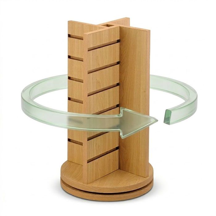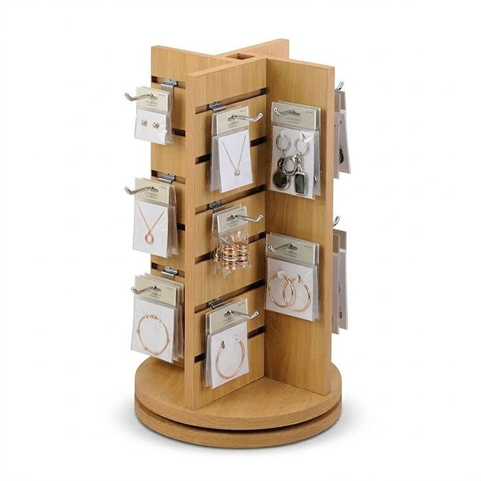Rotating Slatwall Countertop Jewelry Display – 4 Way Mini Pinwheel Showcase more jewelry in less space with this rotating slatwall countertop display. Designed for boutiques, gift shops, and accessory retailers, this compact 4-way mini pinwheel display makes it easy for customers to browse earrings, bracelets, and small accessories from every angle. The smooth rotating base encourages interaction while maximizing visibility on your checkout counter or tabletop.Finished in a warm Maple melamine laminate, this durable countertop jewelry display stand delivers a clean, professional look that complements most retail environments.Features360° rotating base for easy browsing and increased product visibility Four-sided slatwall display maximizes merchandising in a compact footprint 6 slatwall tiers per side for flexible use with hooks and display accessories Compact countertop size ideal for jewelry, accessories, and impulse items Durable maple melamine finish for long-lasting retail useWorks with slatwall hooks such as the DSW36 style. For best stability, we recommend hooks no longer than 4 inches.SpecificationsItem #: JDSP4 Dimensions: 12" W × 12" D × 21.5" H Finish: Maple Display Type: Rotating 4-way slatwall countertop displayShipping Add the item to your cart for a shipping quote. Please allow 5–7 business days for delivery.
