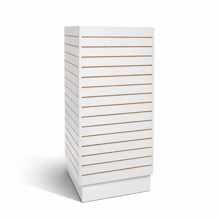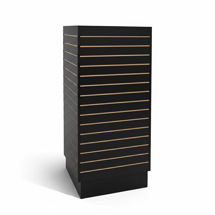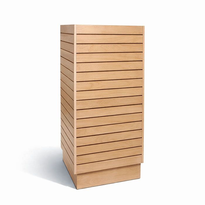 Slatwall Cube Tower | 4-Way Retail Display Fix Maximize your floor's selling potential with the Slatwall Cube Tower. This 360-degree retail display fixture is engineered to turn tight spaces into high-traffic merchandising hubs. Perfect for boutiques, showrooms, and commercial stores, it provides a professional, organized look that invites customers to browse from every angle.360° Merchandising: Four 24"W x 48"H panels allow you to showcase apparel, accessories, and hardgoods simultaneously, increasing product density without adding clutter. Industrial Durability: Constructed with high-density melamine laminate, this tower is built for the daily demands of high-traffic environments. Universal Compatibility: Precision-cut grooves fit all standard slatwall hooks, brackets, and shelves, giving you total control over your layout. Versatile Finishes: Available in Maple, Cherry, Black, and White to match your brand's aesthetic.SpecificationsDimensions: 24"W x 24"D x 54"H (Includes 6" stable base) Display Area: 32 sq. ft. of vertical merchandising space Footprint: Compact 4 sq. ft. design to optimize aisle flowShipping & DeliveryShips Via: Professional Freight (In stock and ready to ship) Delivery: Estimated 5–10 business days nationwide. Assembly: Simple setup required; instructions included. Add to Cart for Shipping Quote