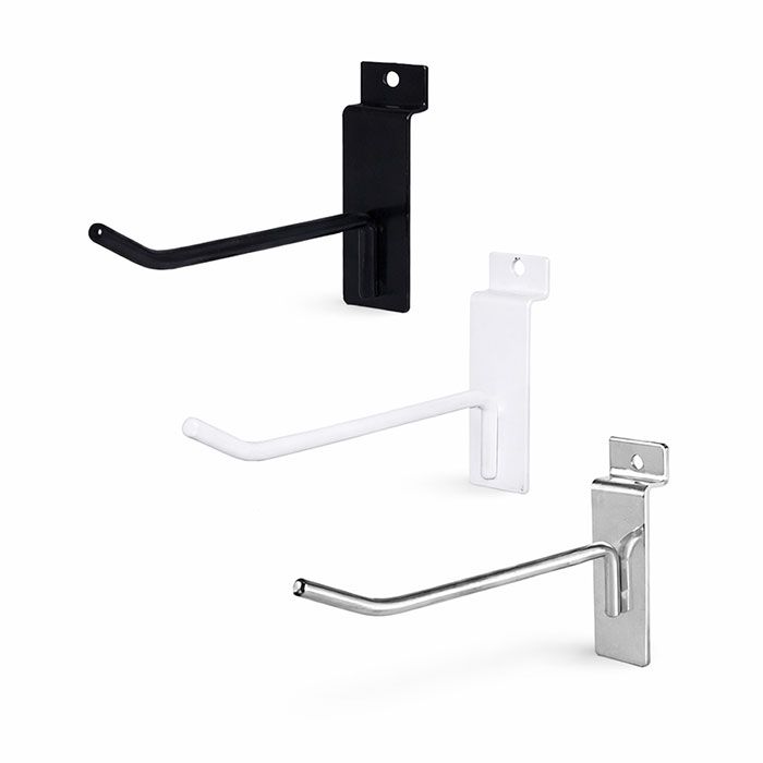 Heavy-Duty Slatwall Hooks | Bulk 100-Pack Retail DisplayMaximize your sales floor and turn empty walls into profit centers. Our commercial-grade slatwall hooks are the professional’s choice for creating organized, high-visibility displays that drive impulse buys.Built from heavy-duty 1/4" steel, these hooks are engineered to withstand the rigors of high-traffic retail. Whether you're outfitting a modern boutique or a busy warehouse, these hooks offer the industrial strength and polished aesthetics needed to keep your inventory front and center.Why Retailers Choose Our Slatwall HooksBoost Floor Efficiency: Clear congestion by utilizing perimeter walls, creating a more spacious shopping flow. Rugged Durability: Choose from polished chrome, powder-coated black, or crisp white finishes designed to resist scratches and stay looking "like-new." Instant Versatility: The 1.5" wide bracket fits standard slatwall perfectly—reposition your displays in seconds with no tools required. Tailored Sizes: Available in lengths from 1" to 12" to accommodate everything from lightweight accessories to heavy packaged goods. Bulk Value: Sold in cost-efficient 100-count cartons, ensuring you have the inventory to maintain a consistent look.Product SpecificationsItem Number: DSW36 Material: 1/4" Diameter High-Quality Steel Bracket Width: Approximately 1 1/2" Length Options: 1", 2", 4", 6", 8", 10", 12" Finish Options: Chrome, Black, White Case Pack: 100 Pieces per BoxShipping & DeliveryLead Time: Ships within 5-7 business days. Shipping Quote: Add this item to your cart for an instant, real-time shipping calculation. Pairing Tip: Complete your retail setup by browsing our selection of Slatwall Panels to find the perfect backdrop for your new hardware.